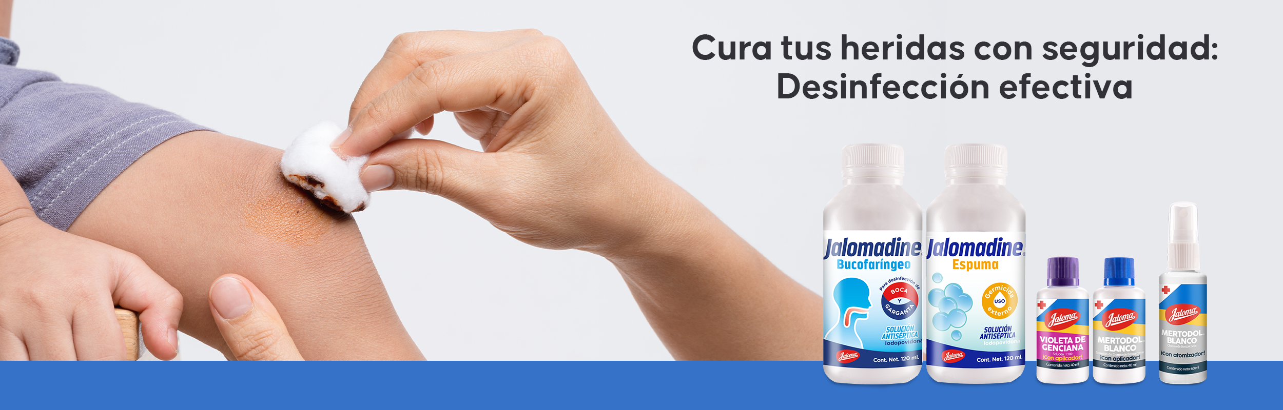 Antiséptico desinfectante auxiliar en heridas superficiales de la piel como raspones, pequeñas cortaduras y quemaduras leves.